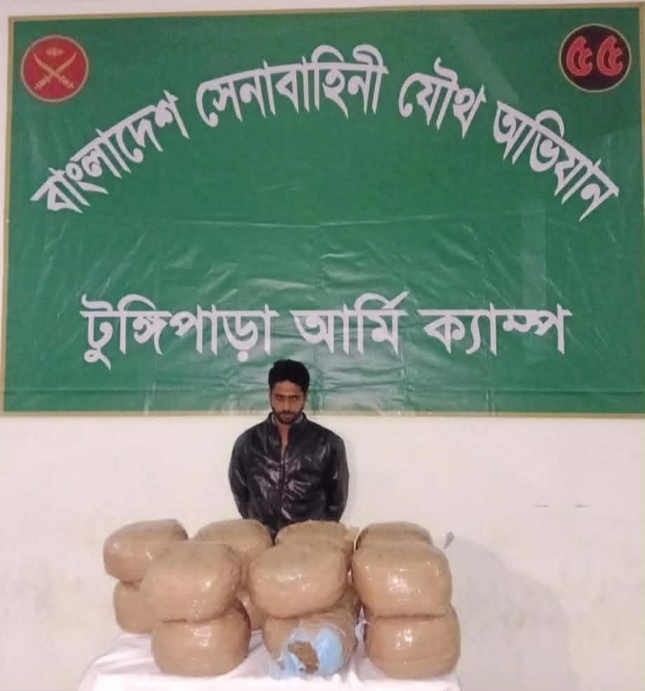 গোপালগঞ্জের টুঙ্গিপাড়ায় সেনাবাহিনীর কঠোর চেকপোস্টে ৩৬ কেজির বেশি গাঁজা উদ্ধার, মাদক পাচারকারী আটক।