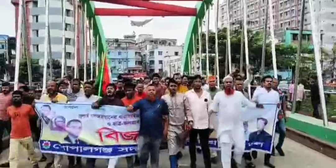 বুধবার (৬ আগস্ট) বেলা ১১টার দিকে গোপালগঞ্জ সদর উপজেলা শ্রমিক দলের সদস্য সচিব রিপন মোল্লার নেতৃত্বে শহরের বিসিক নগরীর সামনে থেকে একটি বিজয় মিছিল বের হয়। মিছিলটি শহরের প্রধান সড়ক প্রদক্ষিণ শেষে মডেল মসজিদের সামনে এসে সমাবেশে মিলিত হয়।