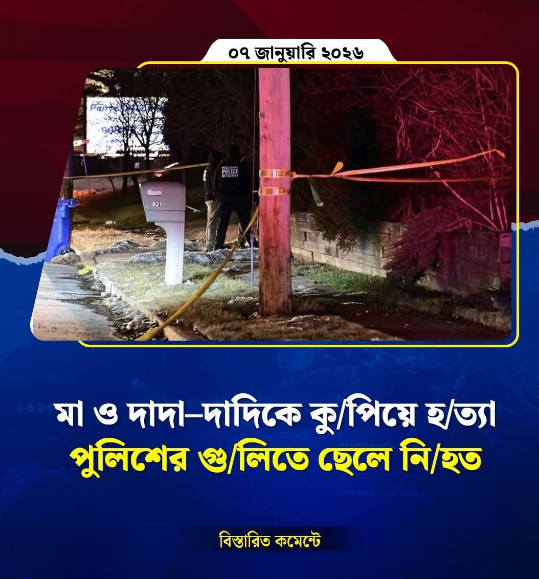 যুক্তরাষ্ট্রের নিউ জার্সি অঙ্গরাজ্যের পিসকাটাওয়ে টাউনশিপে একটি পারিবারিক বিরোধ ভয়াবহ রূপ নেয়। ধারালো ছুরি দিয়ে নিজের মা ও দাদা–দাদিকে কুপিয়ে হত্যা করে এক যুবক। পরে পুলিশের গুলিতে ওই যুবকও নিহত হন।