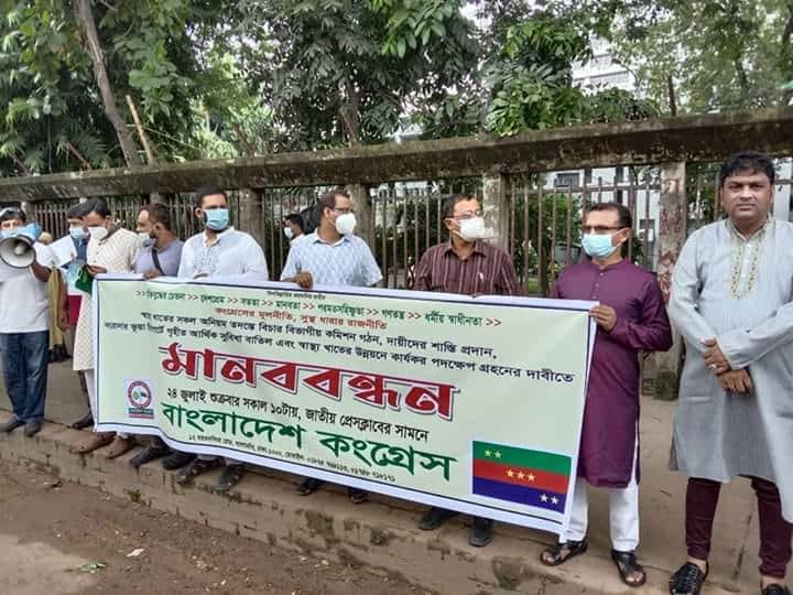 স্বাস্থ্য খাতের সকল অনিয়ম তদন্তে বিচার বিভাগীয় কমিশন গঠন, দায়ীদের শাস্তি প্রদান, করোনার ভূয়া রিপোর্টে গৃহীত আর্থিক সুবিধা বাতিল এবং স্বাস্থ্য খাতের উন্নয়নে কার্যকর পদক্ষেপ গ্রহনের দাবীতে মানববন্ধন করেছে দেশের সর্বশেষ নিবন্ধিত রাজনৈতিক দল বাংলাদেশ কংগ্রেস। জাতীয় প্রেসক্লাবের সামনে আজ ২৪ জুলাই শুক্রবার সকাল ১০টায় বাংলাদেশ কংগ্রেসের চেয়ারমান এ্যাডঃ কাজী রেজাউল হোসেন-এর সভাপতিত্বে অনুষ্ঠিত উক্ত মানববন্ধনে নেতৃবৃন্দ স্বাস্থ্যমন্ত্রীর পদত্যাগ দাবী করেন। নেতৃবৃন্দ বলেন, স্বাস্থ্য খাতের সার্বিক অব্যবস্থাপনার দায় স্বাস্থ্যমন্ত্রীকে নিতে হবে। তার অদক্ষতার কারণে স্বাস্থ্য সংশ্লিষ্ট সকল প্রতিষ্ঠানে দুর্নীতি ও অব্যবস্থাপনা ভয়াবহ আকার ধারণ করেছে।